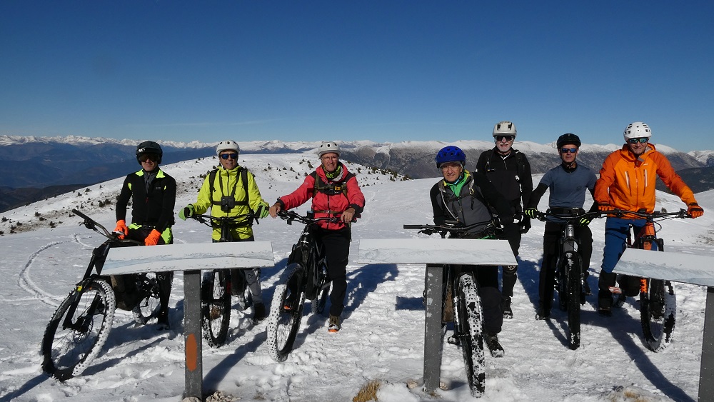 Ruta de la trobada anual del grup cicle alpinístic Overtheclouds a la Vall de Lord. Es tracta d’una ruta força completa i variada que s’inicia al fons de la vall i puja fins el punt culminant del massís del Port del Comte. El punt de sortida és la casa de turisme rural de Cal Marti, situada molt a prop de la vila de Sant Llorenç de Morunys. Es comença a pedalar seguint trams de pista i corriols que ens fan guanyar alçada progressivament pel vessant sud de la serra del Port del Comte. Creuem les carreteres de Solsona i de l’estació d’esquí i arribem a l’antic camí ral de Tuixén. Arribem a la font del Querol i el mirador del Roc de l’Art que ens ofereix unes grans panoràmiques sobre la Vall de Lord. Poc després el camí ens porta fins a l’hotel de l’estació d’esquí on hi fem una aturada per fer-hi un bon esmorzar. Cal refer forces perquè ens esperen unes dures pujades. Només sortir d’aquest establiment comencem a pujar molt fort per la pista Dreta, una pista d’esquí vermella que ens puja fins al mirador del Querol. Una autèntica balconada sobre la Vall de Lord i tota la Catalunya Central, des de més enllà del Montseny fins a les planúries de Lleida. Continuem pedalant per un bonic tram molt panoràmic que ens apropa fins el cim de les Morreres, el cim més septentrional d’aquesta serra que queda una mica malmès perquè acull un vetust repetidor passiu de telefonia. Malgrat això gaudim d’unes grans panoràmiques. Baixem ràpidament per les restes d’una pista de servei en direcció al Forat de la Bòfia, un avenc d’uns 35 metres de fondària on hi habiten gralles de bec groc. Continuem baixant fins el Clot de la Vall on hi ha emplaçada una gran bassa per a ús del servei d’innivació a les pistes d’esquí. Ara ens espera una dura pujada fins el Clot de l’Orri seguint les traces d’una pista d’esquí. Abans d’arribar-hi comencem a trobar una mica de neu que a mida que anem pujant es va incrementant fins a cobrir la totalitat del paisatge. Comencem a fer snowbike del bo. La capa nival no és massa gruixuda i es permet avançar pedalant, això si, amb algunes dificultats i que fan que l’avançament sigui molt més lent i fatigós. Però val molt la pena. Gaudim d’uns paisatges impressionants i a més fa un dia radiant. Ens hi deleitem i sense pressa arribem finalment al cim del Pedró dels Quatre Batlles. Hem aconseguit fer el cim!!. Aquest cim, per la seva situació geogràfica ofereix unes panoràmiques molt extenses als quatre vents. Destaco les panoràmiques pirinenques on si som observadors podem divisar des del Mont Perdut fins el Puigmal. Unes taules d’orientació ens ajuden a distingir els cims més emblemàtics. Comencem la davallada mentre anem surfejant per sobre la neu. Creuem les planúries de Coma Condesa i arribem a l’arrodonit cim del Cap de les Pedrusques des d’on perdem alçada ràpidament baixant sense camí per un terreny pedregós fins assolir el Prat Piquer i l’extens Pla de Bacies, la zona més extensa de pastura estival d’aquesta serra. La neu ja s’ha acabat. Pedalem còmodament per aquesta immensa catifa herbada i anem a buscar el seu extrem septentrional on trobem l’inici del tècnic Camí dels Isards que ens baixa fins a la casa de Les Costes. És el camí més ràpid i utilitzat per excursionistes i bestiar per pujar a les pastures de Bacies des de Coll de Jou. Passem per aquest coll, important nus de carreteres, i ens dirigim a l’àrea recreativa de la Creu del Codó, passem entre taules i barbacoes i anem a cercar l’inici que baixa cap el Cap de la Roca de Forat Micó. Ara gaudim d’unes panoràmiques molt diferents. A la nostra dreta les profundes foranques de Vilamala, la mola de Lord amb el santuari i, a la llunyania, l’encinglerada serra de Busa. Anem seguint un corriol de bon fer amb algun pas una mica tècnic i que ens baixa fins el camí ral entre Sant Llorenç de Morunys i Solsona que seguim fins arriban a l’escletxa del Roc Foradat, un trau estret de roca per on s’escola el camí. Finalment arribem a la pista d’accés al santuari de Lord i ràpidament tornem a ser a Cal Marti on donem per acabada aquesta interessant i molt variada ruta que ens haurà ajudat a conèixer aquesta zona muntanyenca de la Vall de Lord i el Port del Comte.